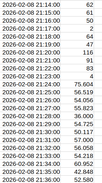 Abbildung: Zugriffsanzahlen pro Minute, X-Achse: Minuten ab 21:00 Uhr. vor Minute 24 und nach Minute 124 sind die üblichen Zugriffszahlen “zu sehen”