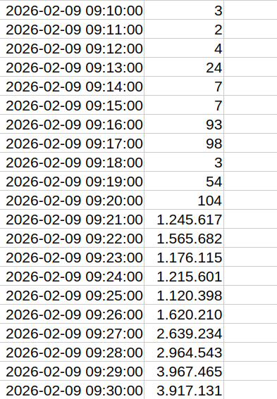 Die Lösung erhielten wir am Folgetag: Am Montag, den 09.02. um 9:21 Uhr, erreichte uns eine zweite, diesmal wesentlich größere Welle. Waren es am Vorabend noch 50.000 Zugriffe pro Minute, begann diese Welle gleich mit 1.2 Millionen Zugriffen pro Minute und steigerte sich auf ein Maximum von 6,3 Millionen Zugriffe pro Minute: